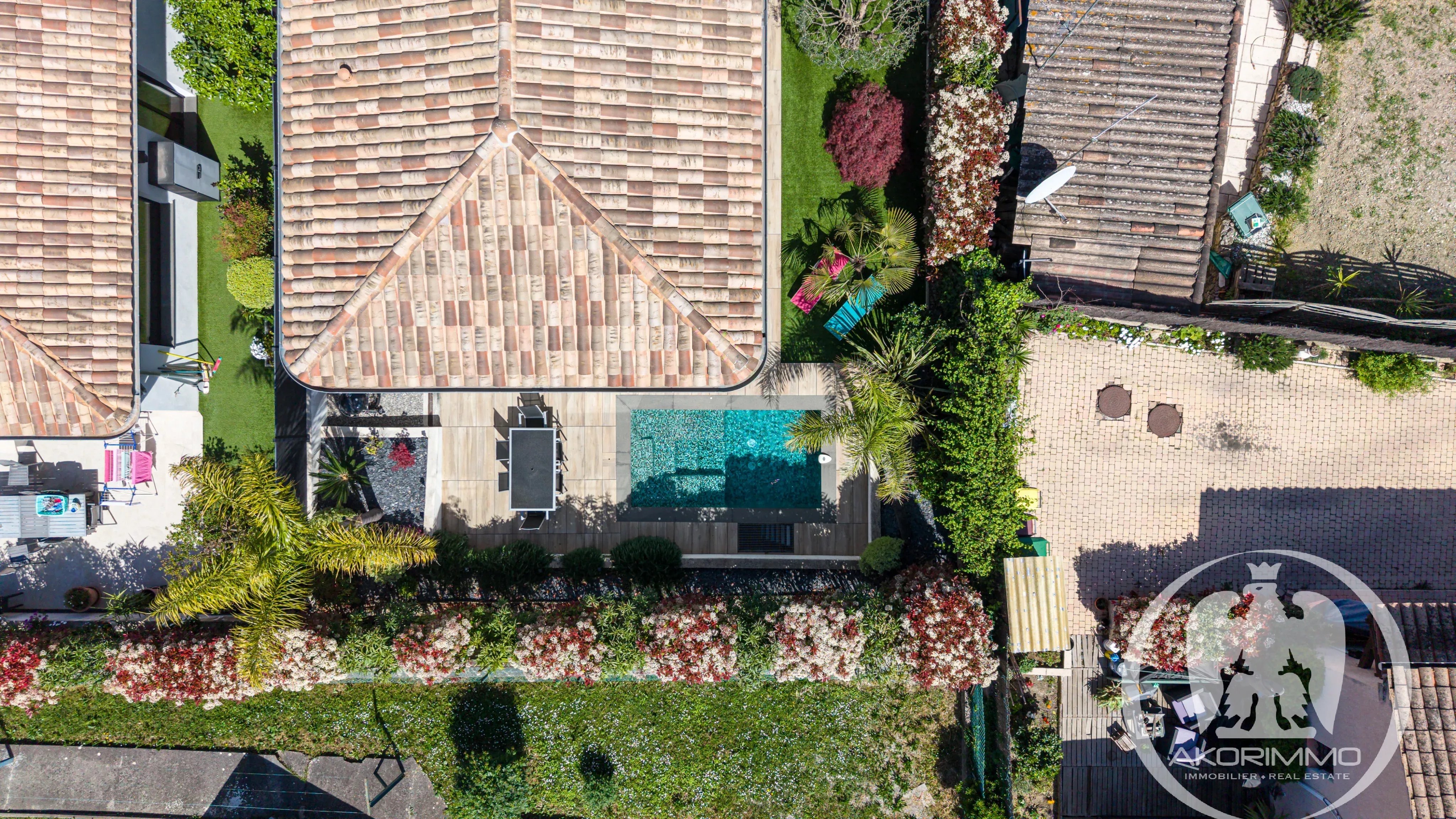 L’extérieur s’organise autour d’une grande terrasse et d’une piscine, véritables espaces de vie à part entière.