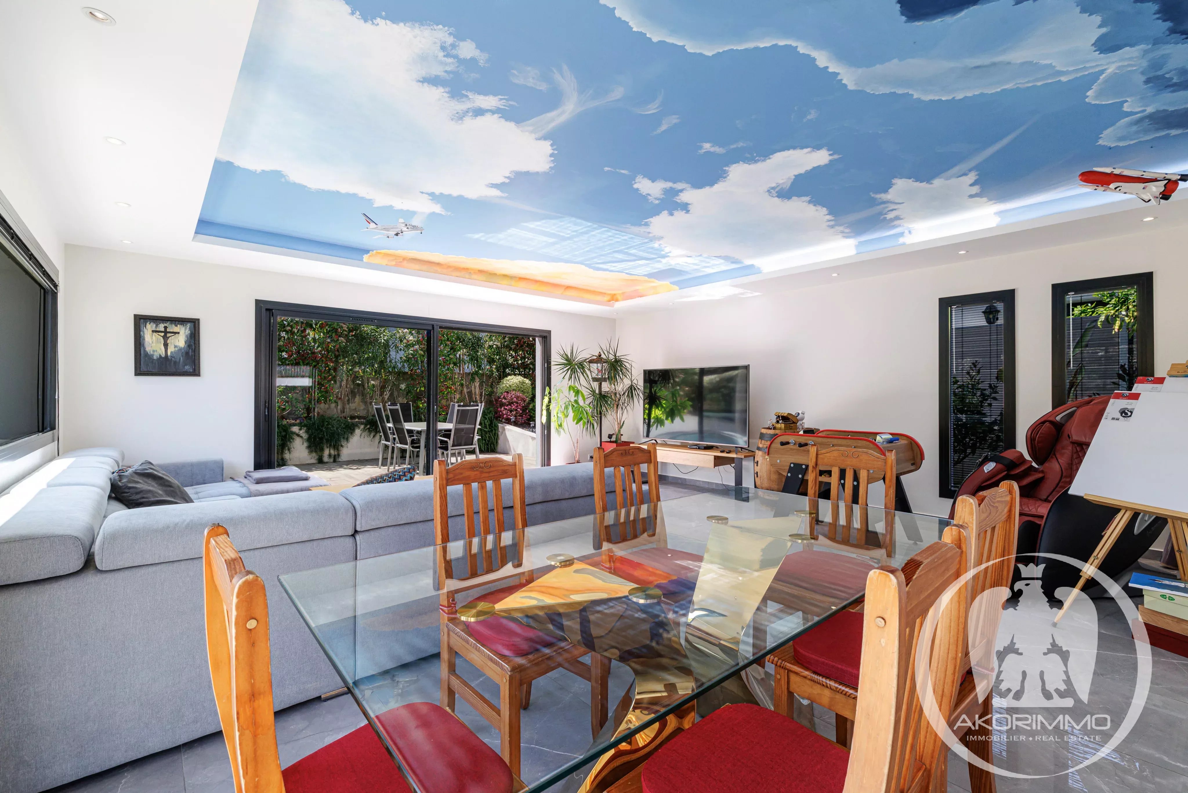 Le séjour, aux beaux volumes, bénéficie d’une large ouverture sur l’extérieur, prolongeant naturellement l’espace de vie vers le jardin et la terrasse.