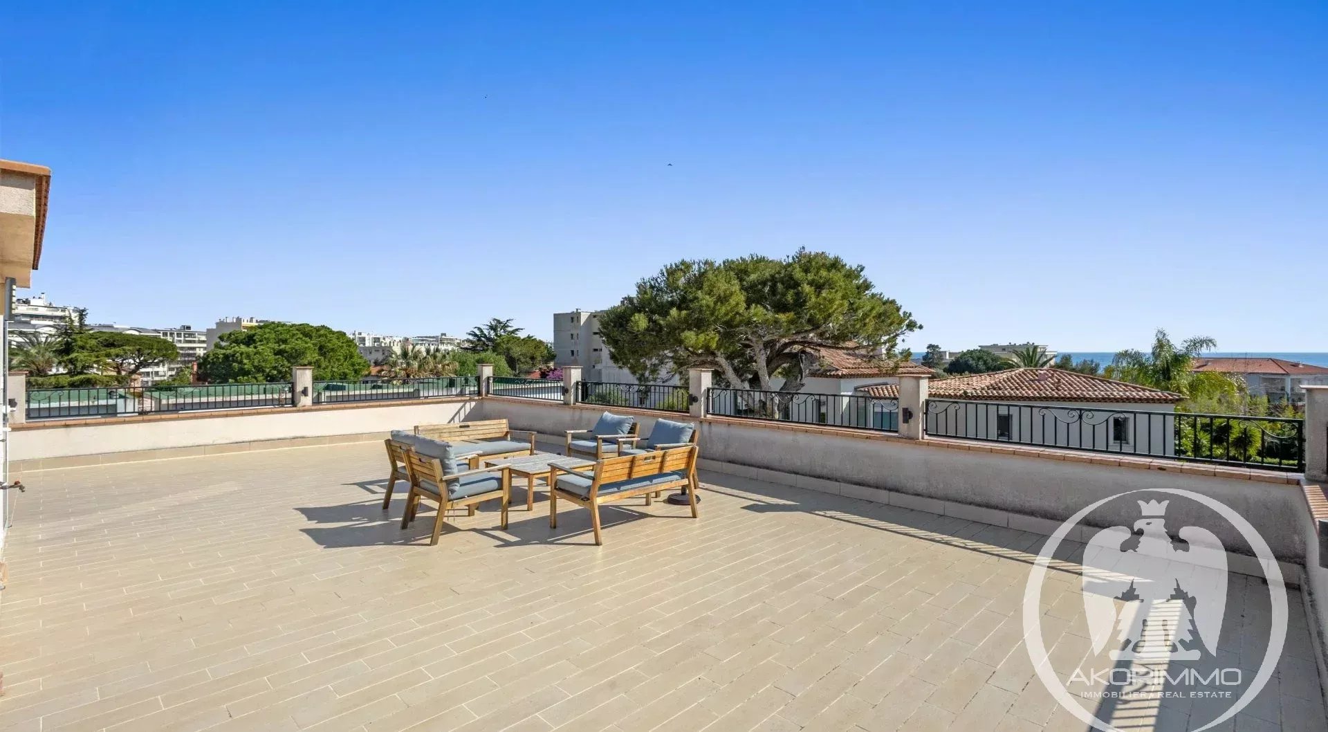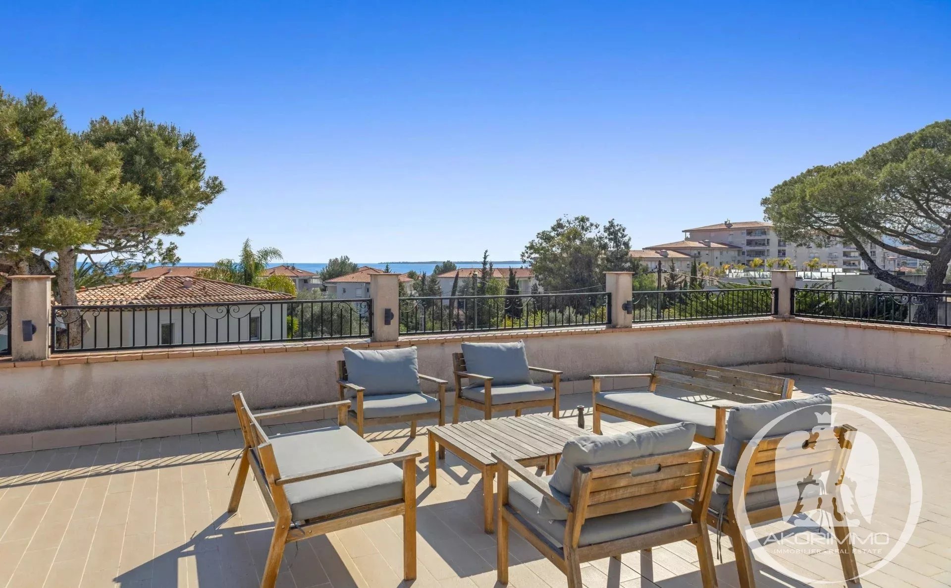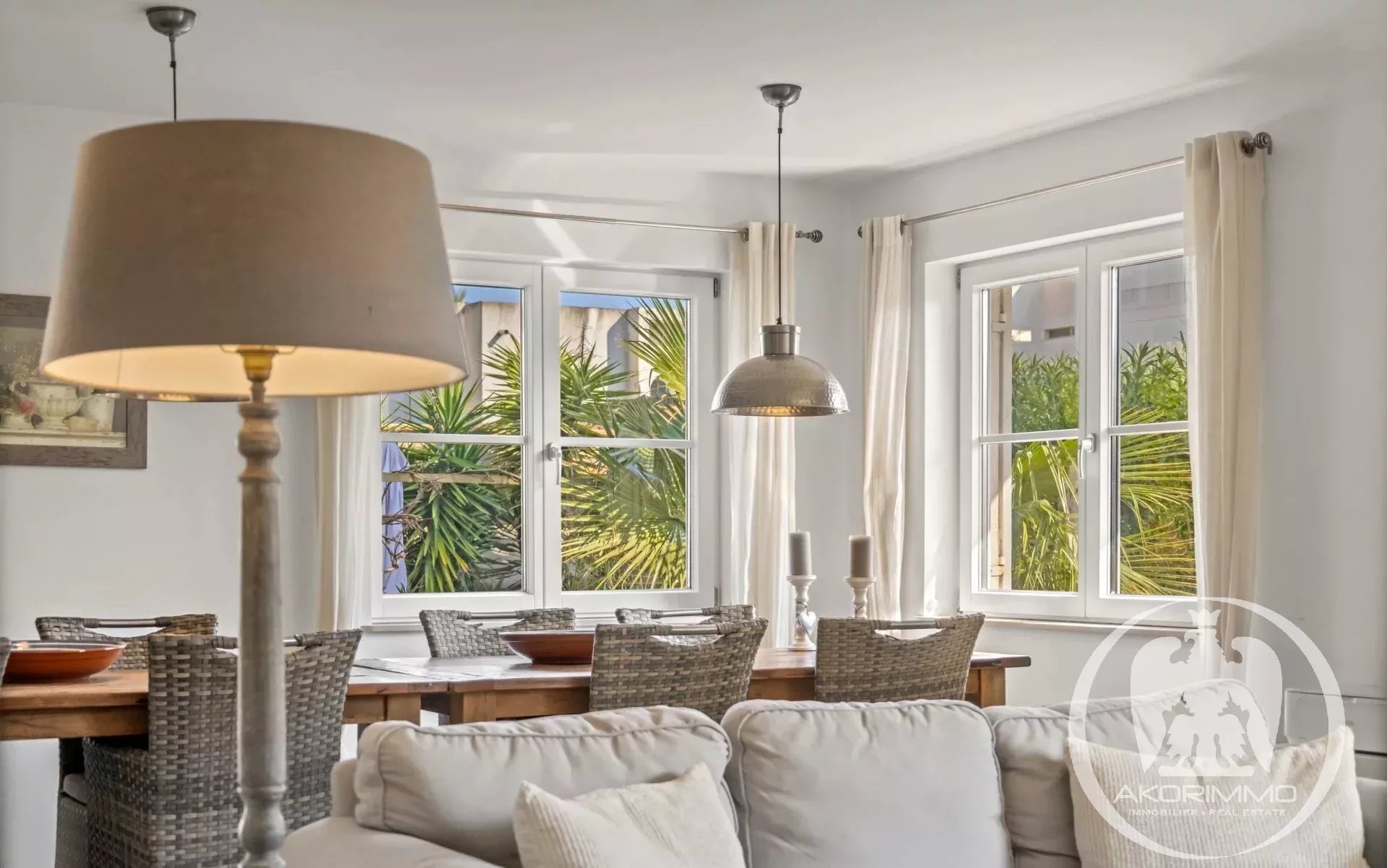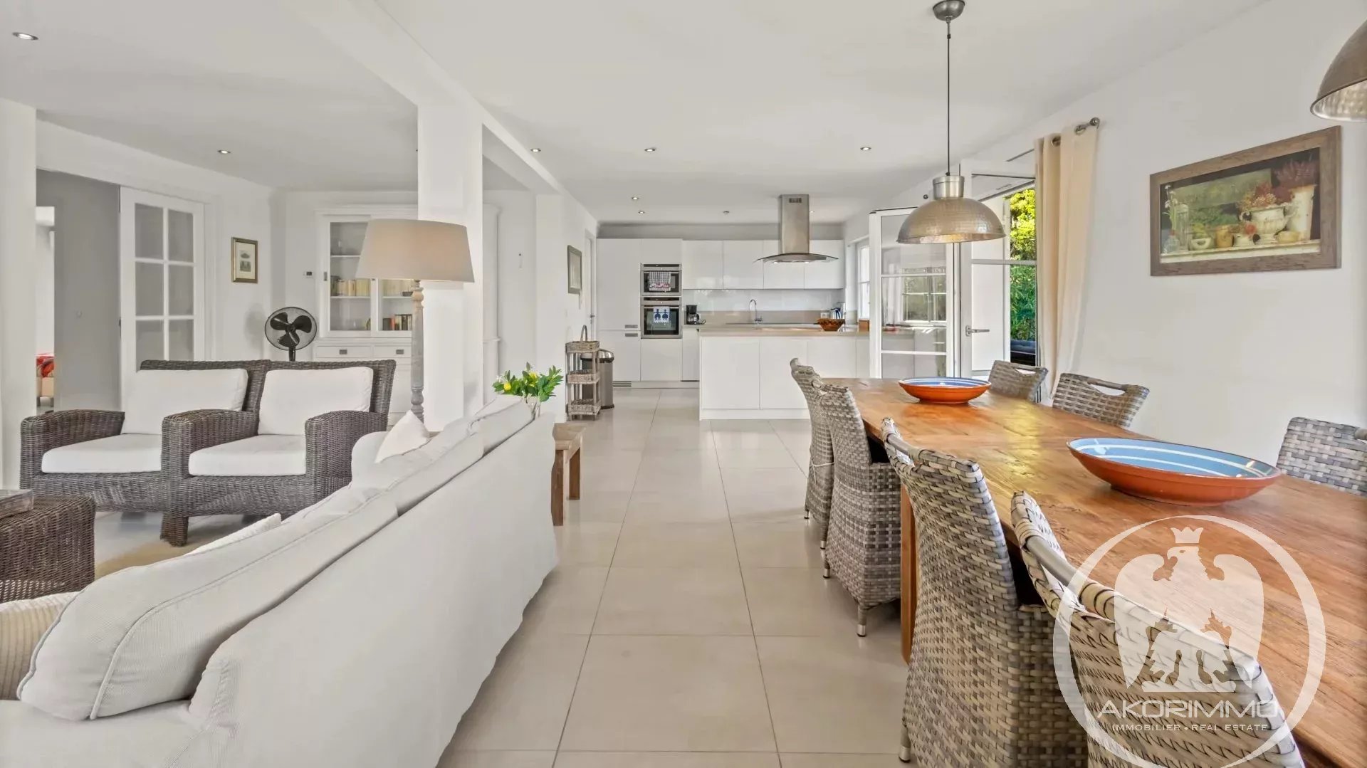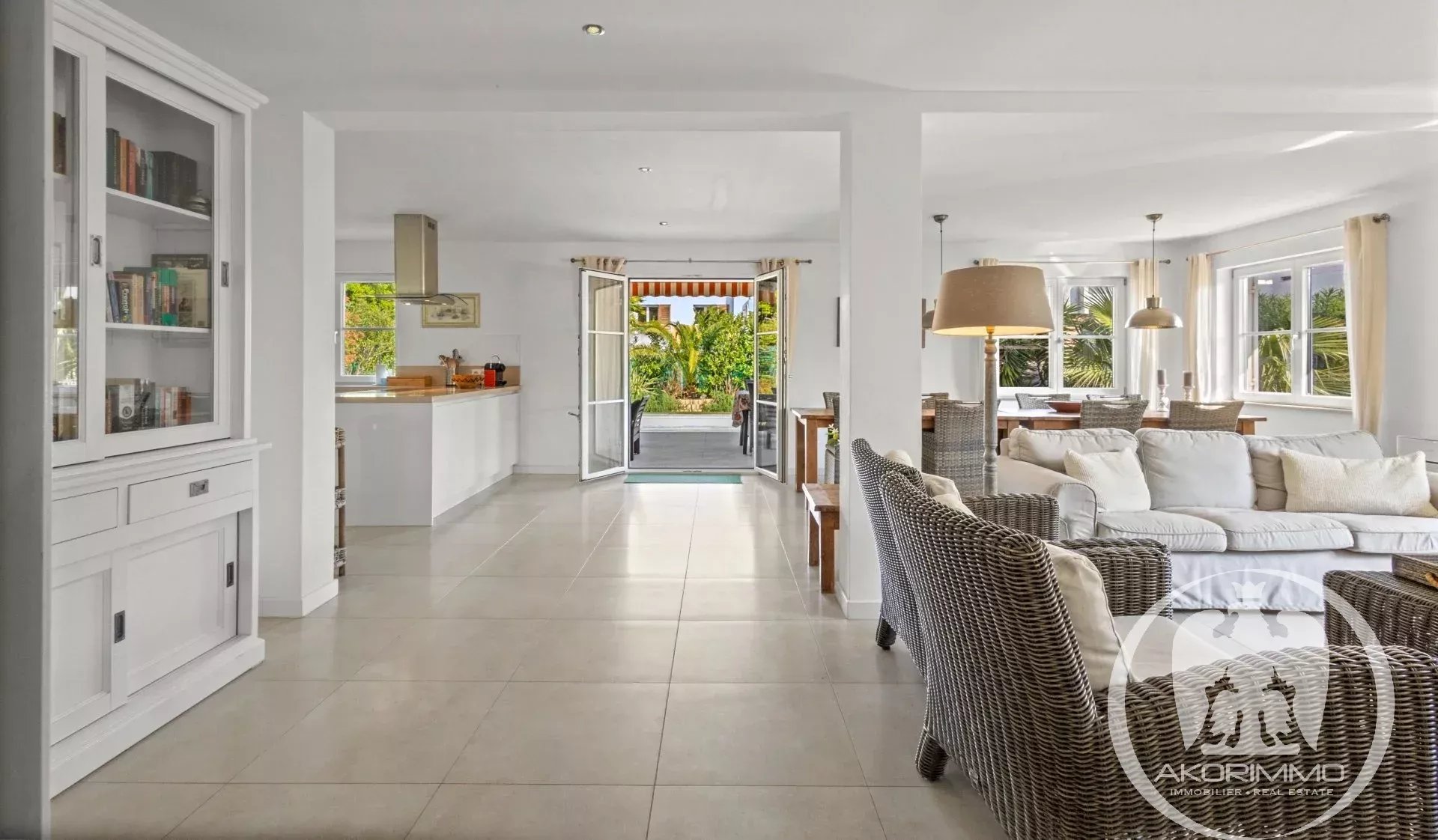 A soli 5 minuti a piedi dalle spiagge sabbiose di Juan-les-Pins, questa villa gode di una tripla esposizione che garantisce una bellissima luce naturale tutto il giorno. L’area living di circa 60 m², con soggiorno, sala da pranzo e cucina a vista, comunica direttamente con l’esterno, offrendo una sensazione di spazio fluido e piacevole.