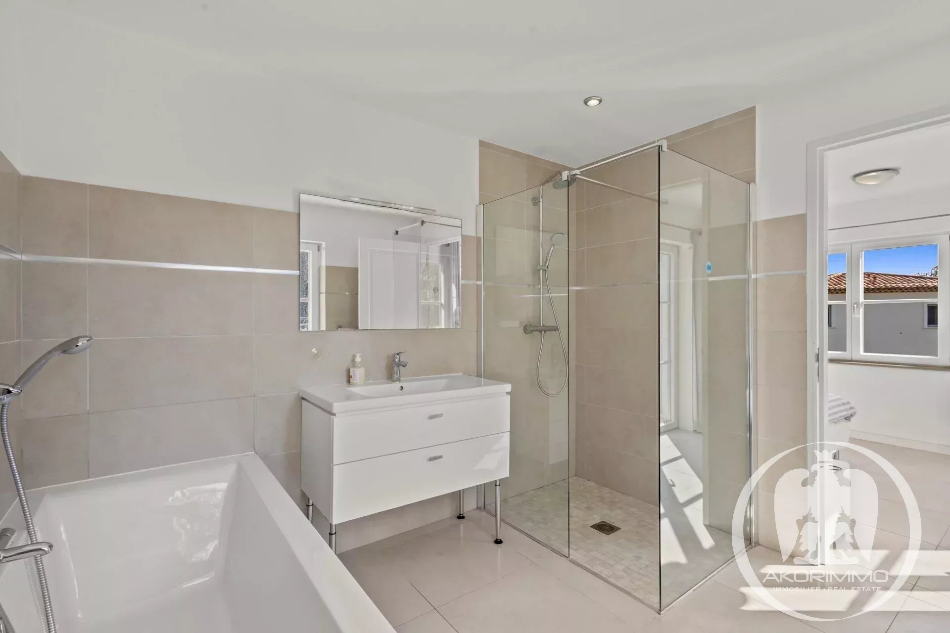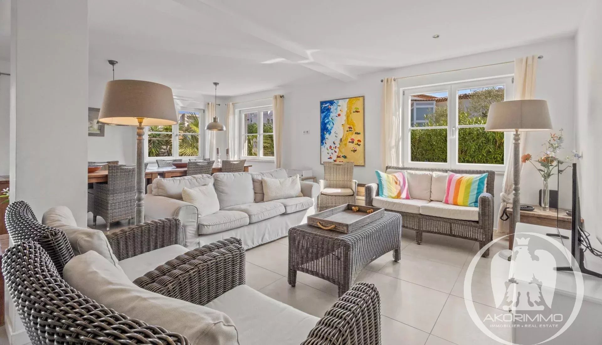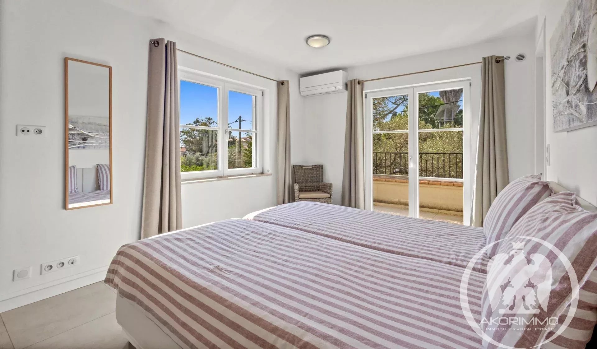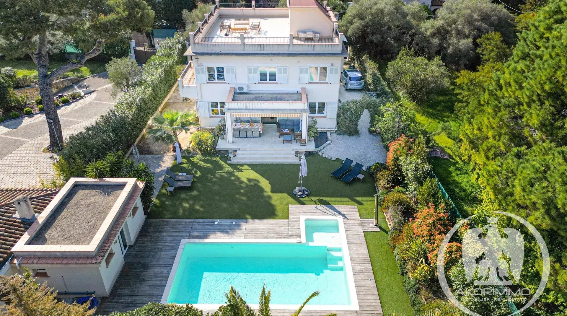 A soli 5 minuti a piedi dalle spiagge sabbiose di Juan-les-Pins, questa villa gode di una tripla esposizione che garantisce una bellissima luce naturale tutto il giorno. L’area living di circa 60 m², con soggiorno, sala da pranzo e cucina a vista, comunica direttamente con l’esterno, offrendo una sensazione di spazio fluido e piacevole.